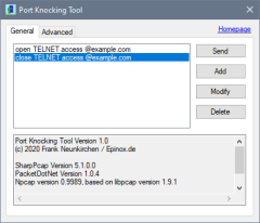 Die Windows-Anwendung Port Knocking Tool ist ein Client mit grafischer Benutzeroberfläche (GUI), der die entsprechende Reihenfolge der SYN-Pakete an den geschützten Server sendet. Dabei werden sowohl UDP als auch TCP-Pakete unterstützt. Eine Konsolenanwendung ist zusätzlich vorhanden.